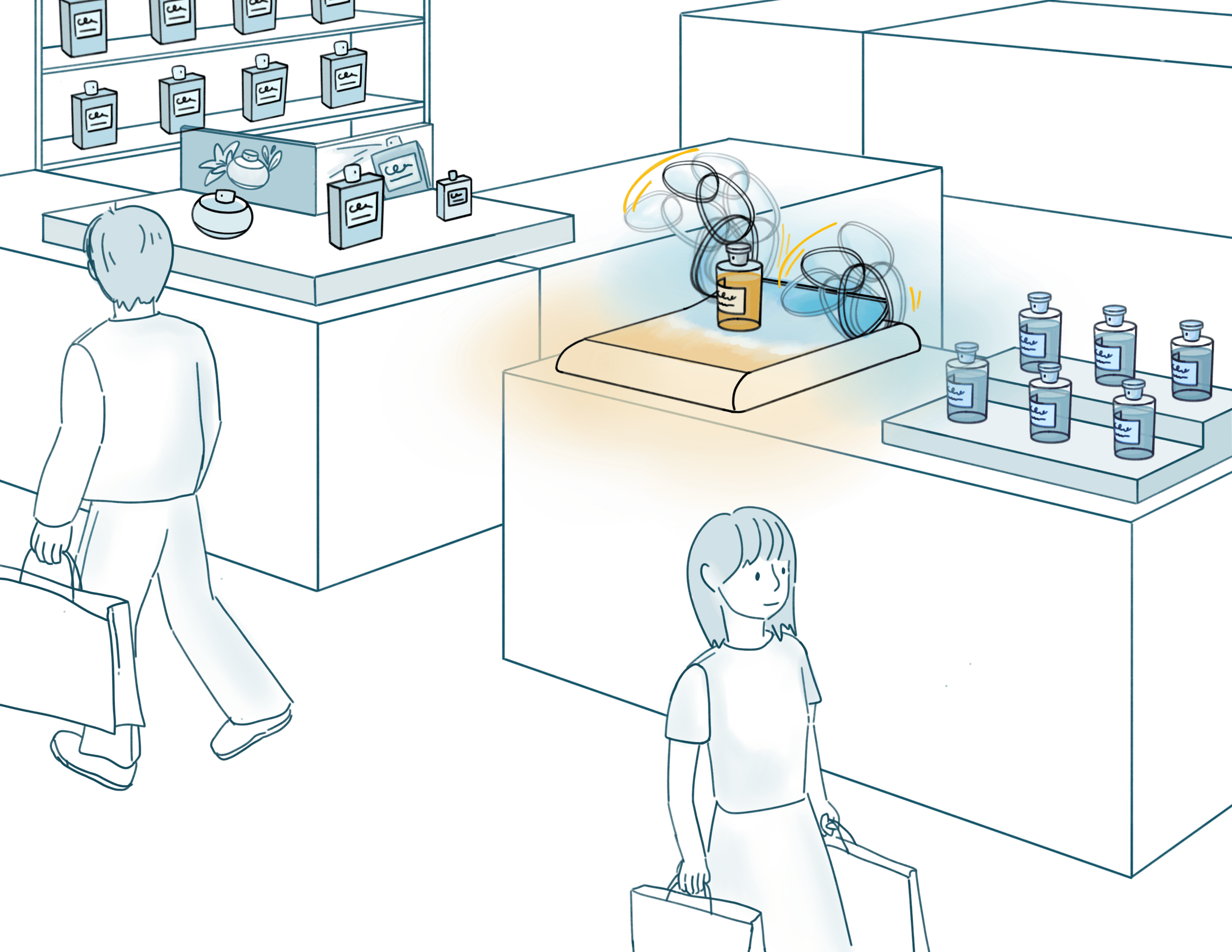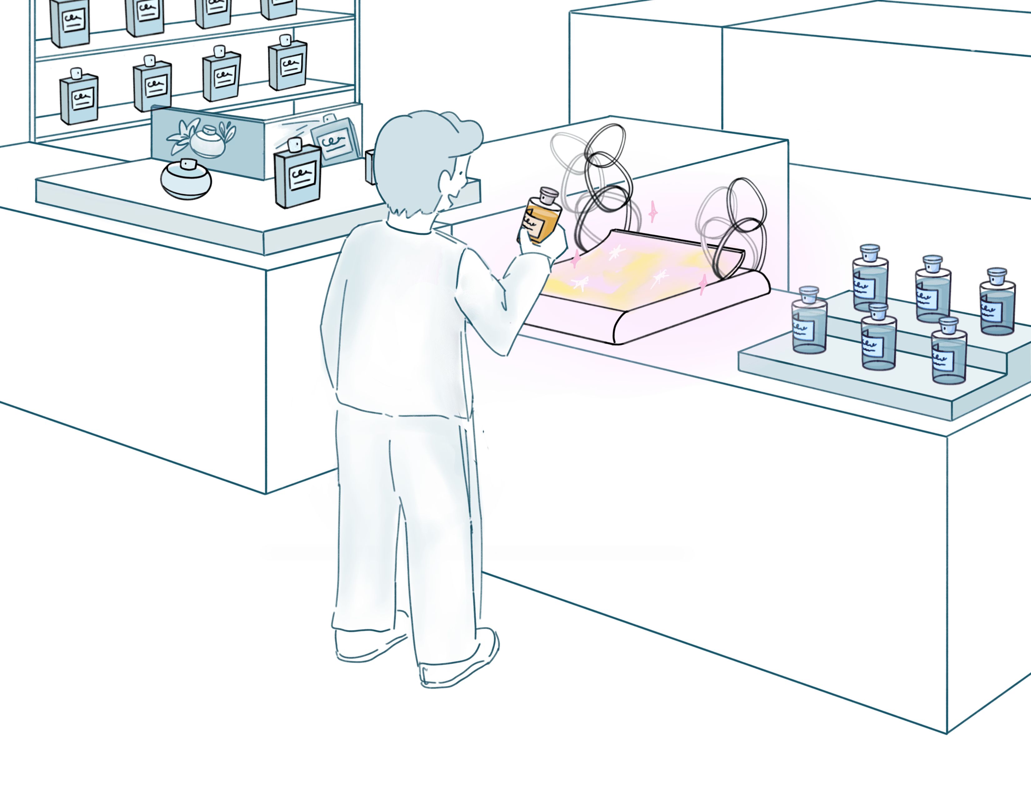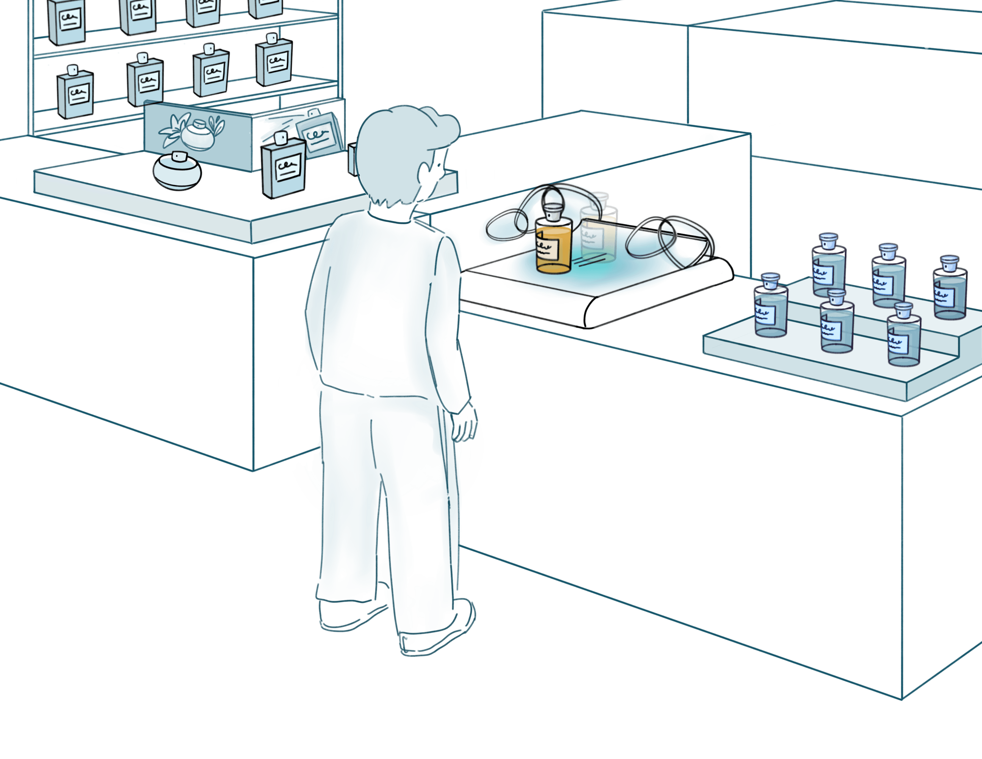 we created a small mock retail environment and compared the interactive installation against typical static fragrance displays. Participants were asked to treat the setup as a real store. They were encouraged to browse freely, touch the bottles, sample scents, and compare products using testing strips, just as they would in an actual retail setting.