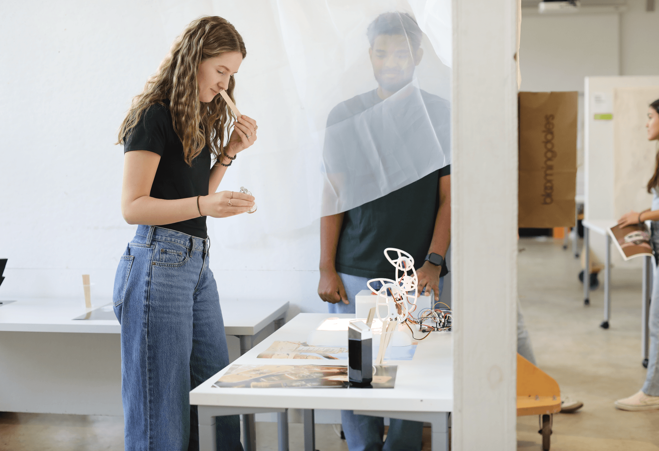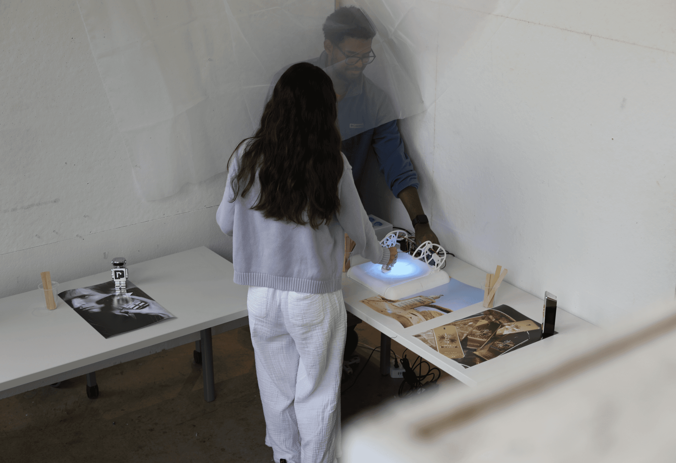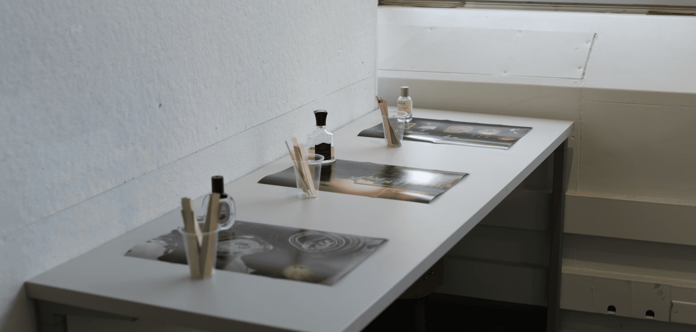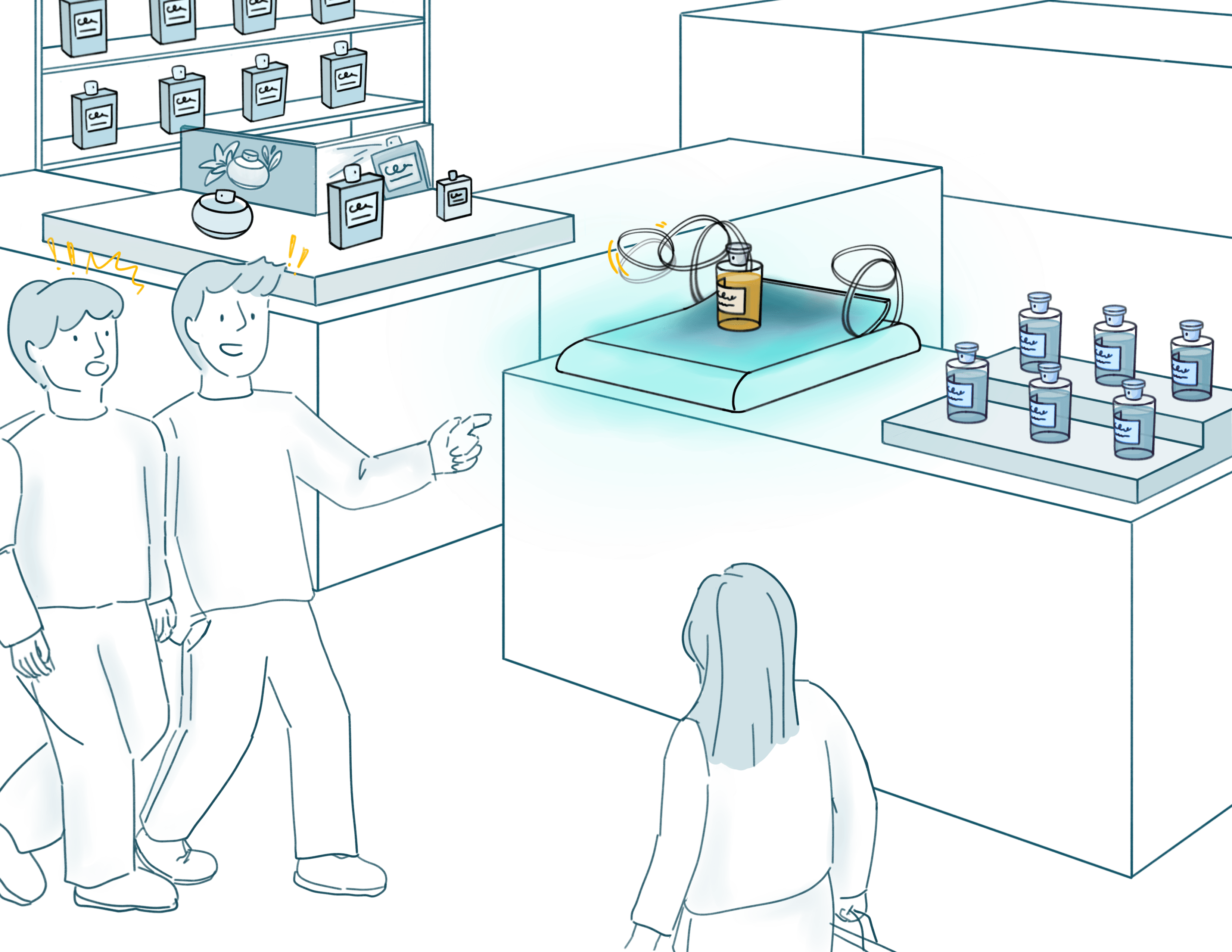we created a small mock retail environment and compared the interactive installation against typical static fragrance displays. Participants were asked to treat the setup as a real store. They were encouraged to browse freely, touch the bottles, sample scents, and compare products using testing strips, just as they would in an actual retail setting.