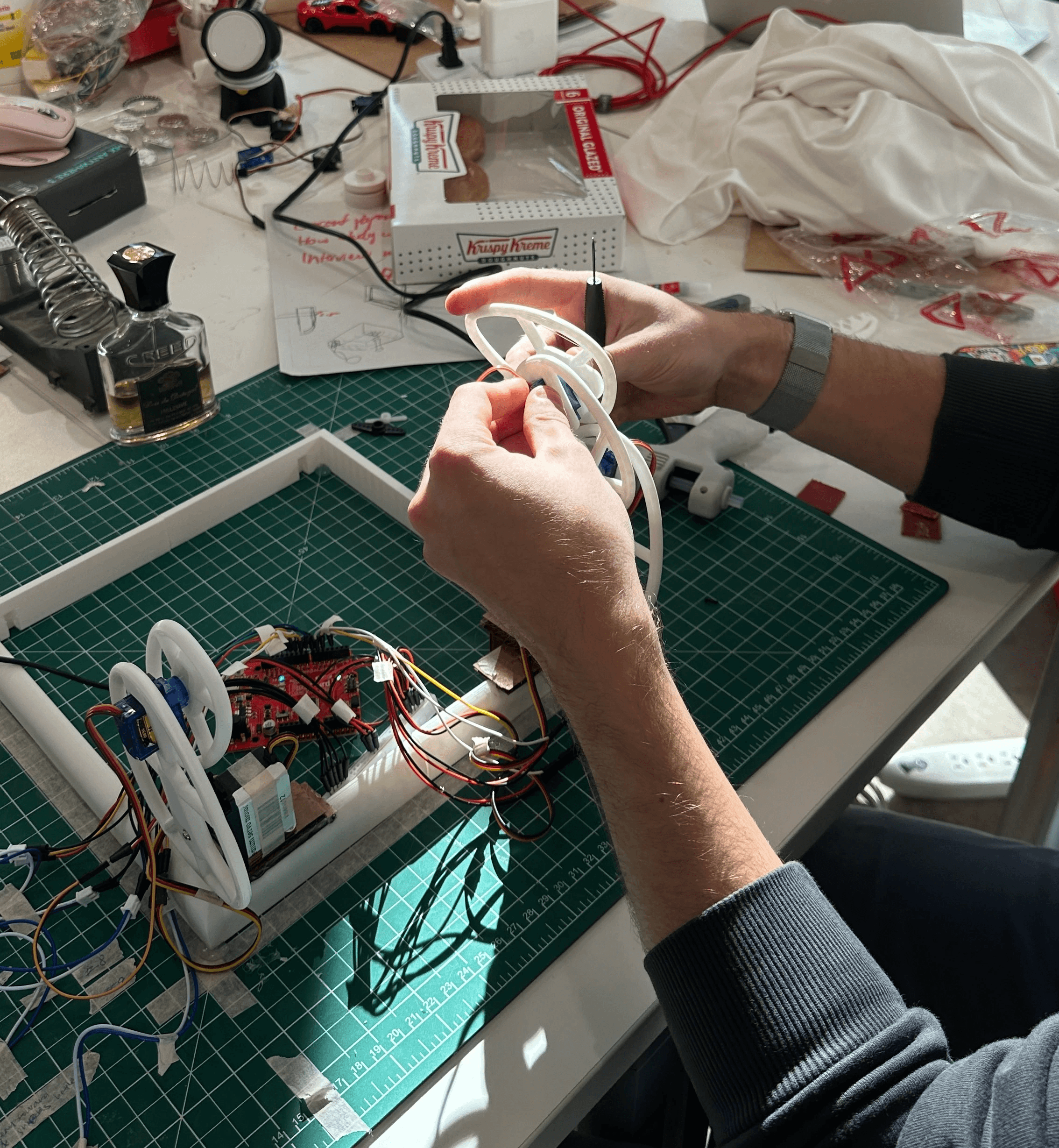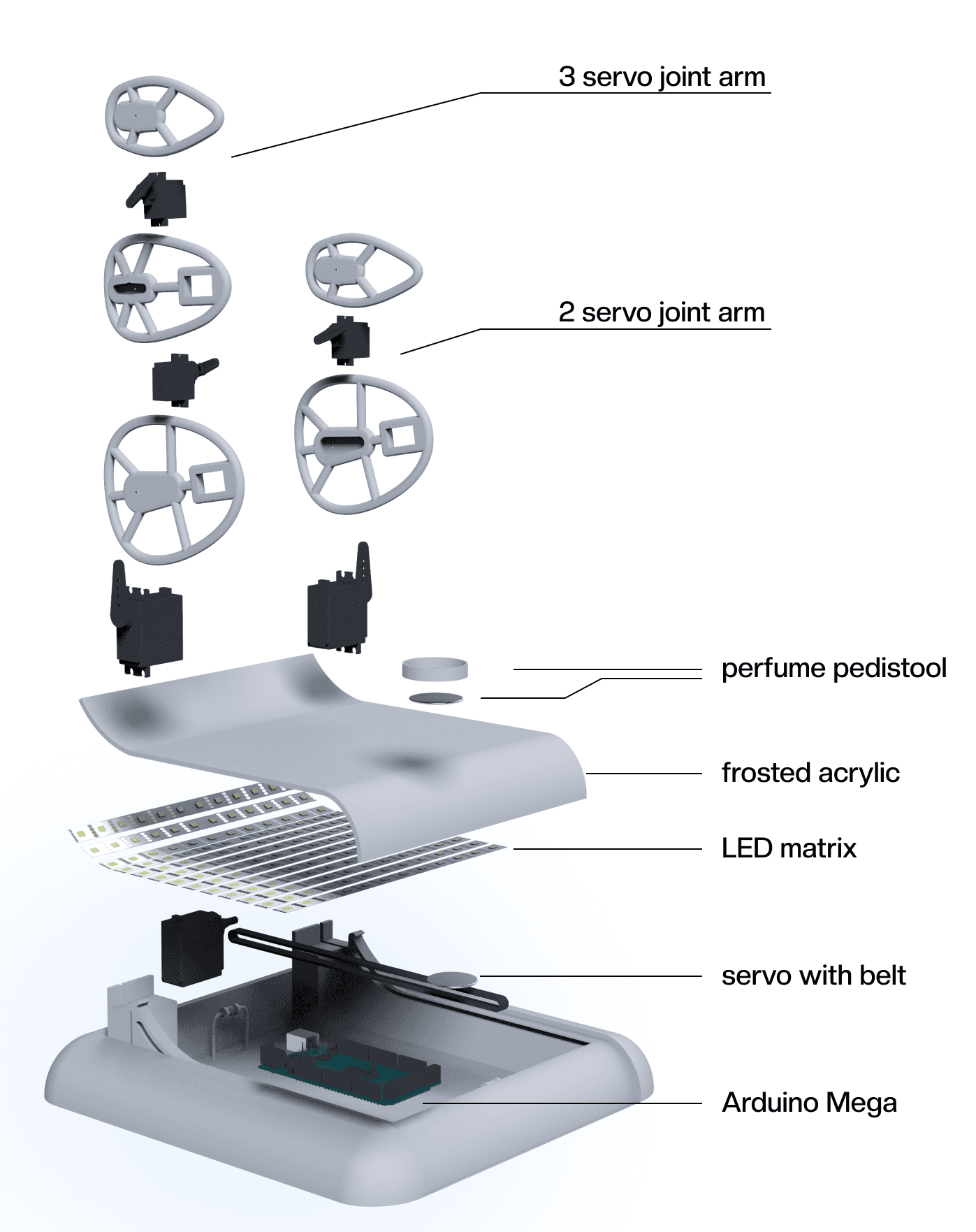 As the user moves closer, the robotic arms lean forward and push the perfume bottle
